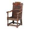 the shaped crest rail carved with stylised flowerheads and dated ANNO 1656, above a double panel back carved with geometric bands, over a plank seat flanked by scrolled arms on turned baluster supports, raised on turned and tapered legs joined by peripheral stretchers