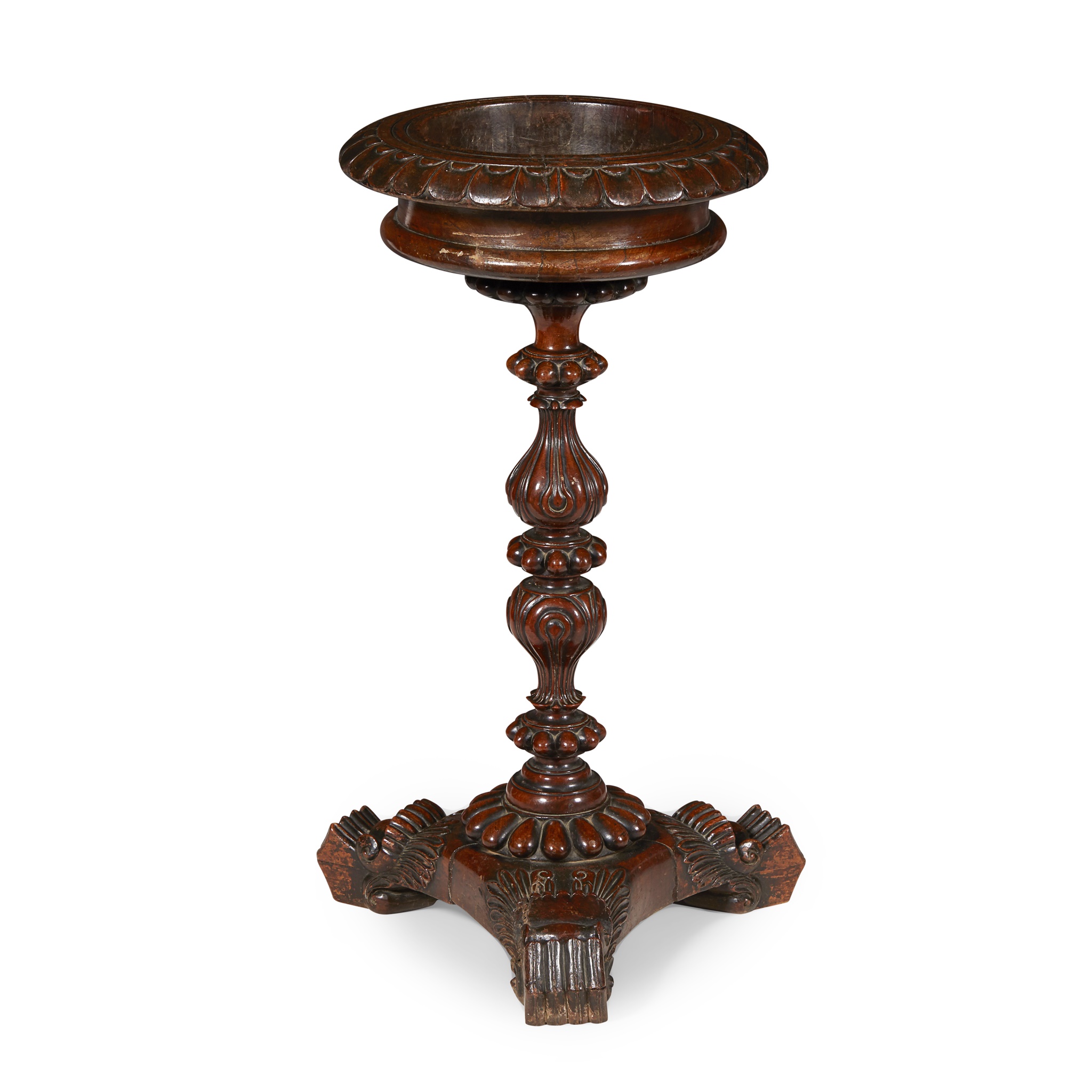 the circular top with a lappet carved edge and a pot recess and draining hole, on bead and lobed carved baluster support and triform base with scroll feet