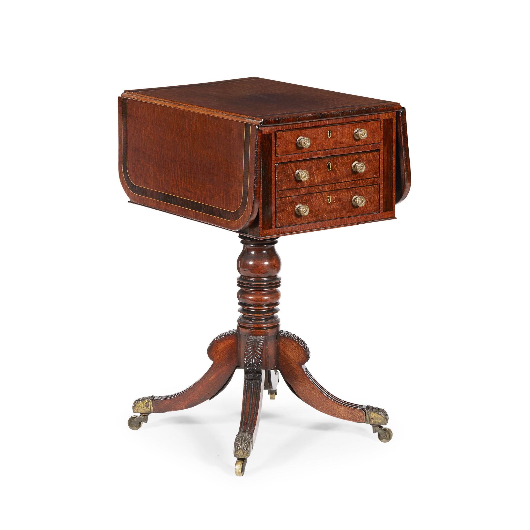 the rounded rectangular top with drop sides above two long drawers, the bottom drawer with a double front, raised on a turned column and four outswept reeded legs ending in brass caps and castors
