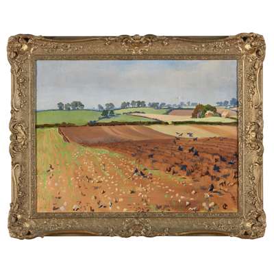 Note: Reviewers of Codrington’s exhibition in 1927 commented particularly on landscapes painted within reach of her home at Wistler’s Wood. ‘The Surrey hills and vales’ for one critic, provoked in her ‘the sudden development of her feeling for light and colour … [and] patterns of flowing rhythm that hold a hint of the … subconscious influence of Japanese design …’ (The Observer, 10 April 1927). As in her figure studies, Codrington looks for clean lines and pure colours. In this, she was indeed ‘in the forefront of the movement’ in British landscape painting and for works like Ploughed Field, stands beside John Nash and Stanley Spencer.