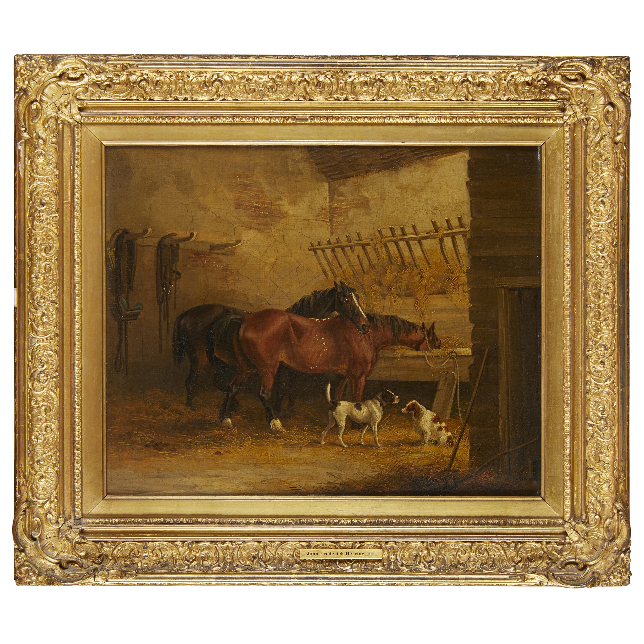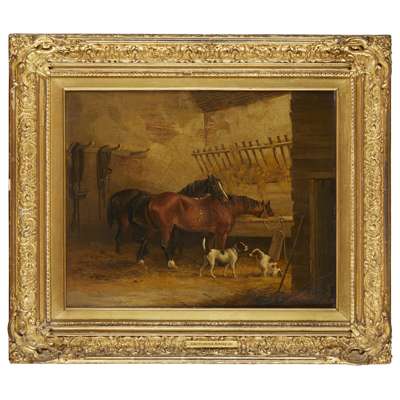 Horses and dogs in a stable interior