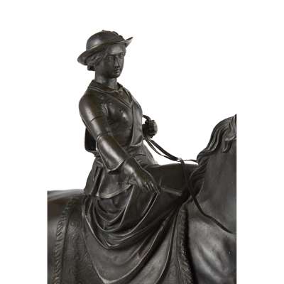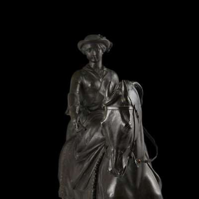 Note: Arriving at the Great Exhibition in 1851 visitors were met in the central courtyard by a larger-than-life plaster statue of Queen Victoria on horseback by Thomas Thornycroft. The composition, believed to be derived from an engraving of Victoria reviewing the troops at Chobham, was greatly admired by the sovereign and Prince Albert. Some critics however, felt this version, which showed Victoria in contemporary dress on her lively Arabian horse, too modern, with The Times reviewer going so far as to brand it ‘too anatomical’. Nevertheless, it was favoured by the Queen and used later with some alterations for a large bronze group to accompany an equestrian figure of Prince Albert outside St George’s Hall, Liverpool, completed in 1869.