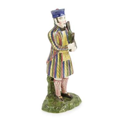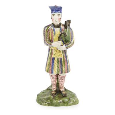 in polychrome 'tartan' jacket and kilt, playing the pipes, and raised on a naturalistic base