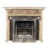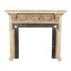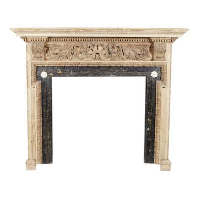 the dentil moulded shelf above a frieze carved with foliate scrolls, flowers, and a central leaf motif flanked by acanthus brackets, above a flower and leaf tip carved opening with a Portoro marble moulded surround marked at the corners with carved white marble flower heads; the register with circular bosses and a grate surmounted with urn finials above a pierced apron and ash tray