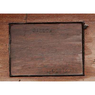 the oval top with a bead moulded edge on a reeded baluster column stamped 'GILLOW' and numbered 00576314, on four scrolling legs ending in carved paw feet with recessed brass castors