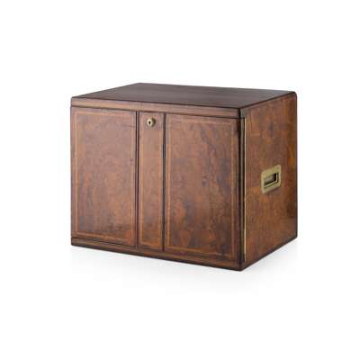 of cubic form, the front with a pair of banded cupboard doors fitted with a Bramah lock and opening to three drawers with recessed brass handles, the sides with further recessed handles