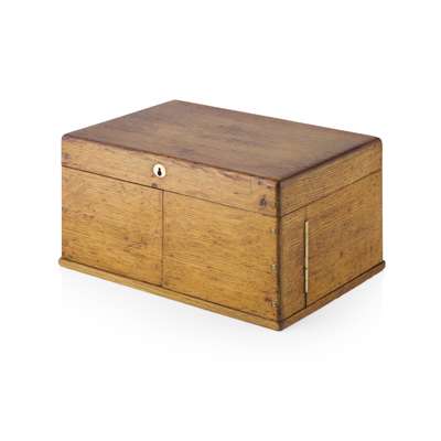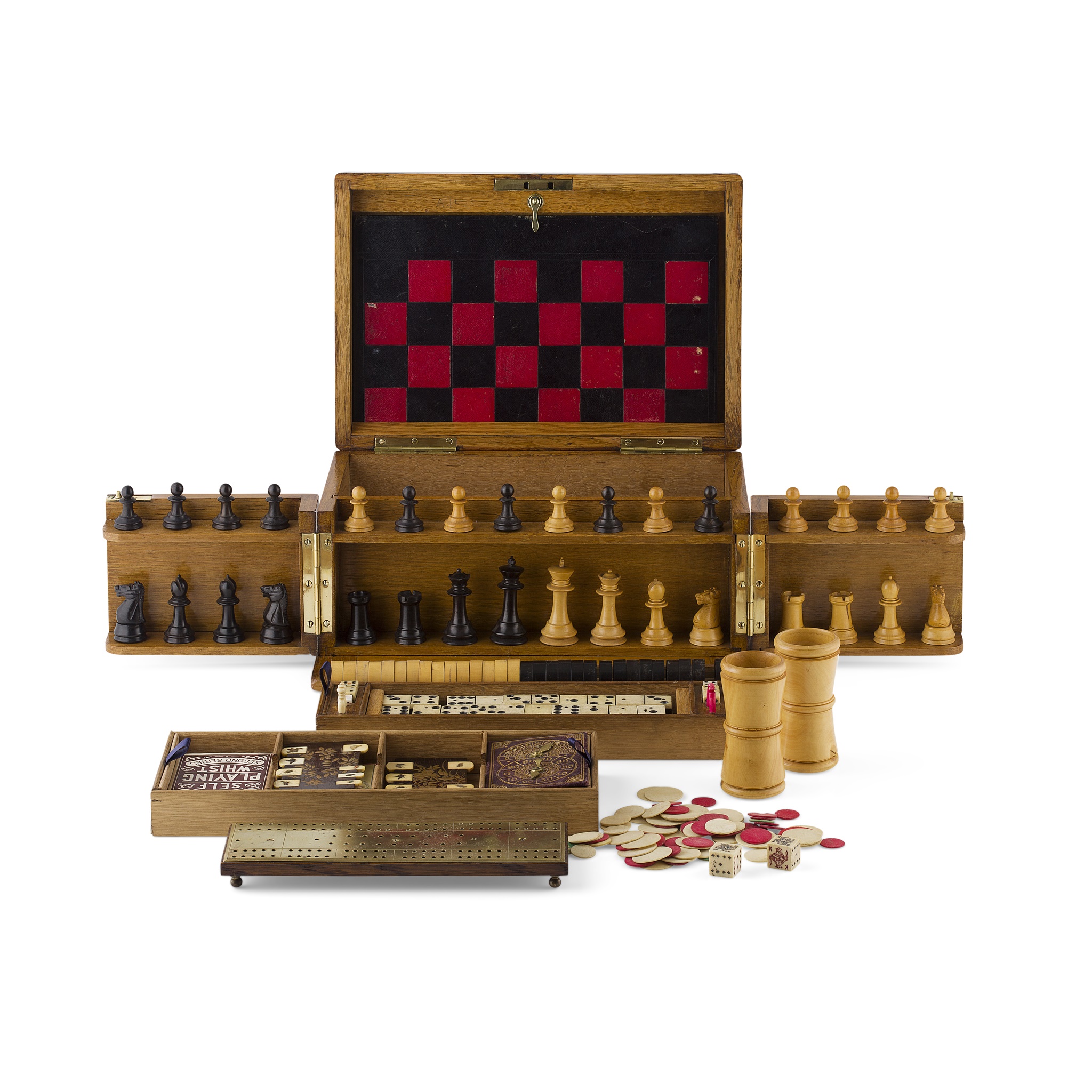 of rectangular form, opening to a fitted interior with lift-out trays and a hinged front, complete with leather chess and backgammon boards, chess pieces, ivory dominoes, cards, draughts and die, and counters