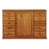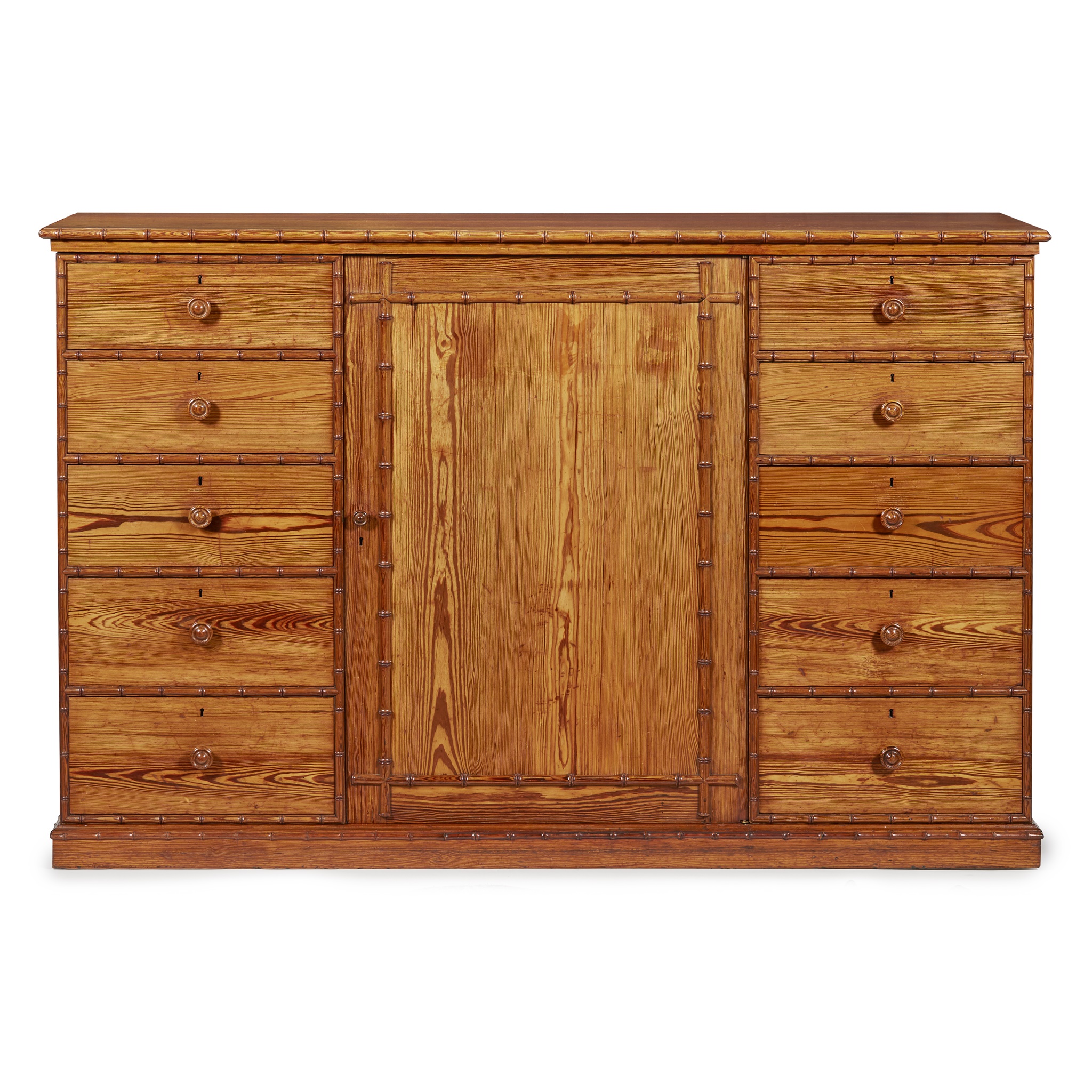 with a central cupboard door enclosing shelves flanked by banks of five drawers outlined with simulated bamboo, one a plinth base, one drawer stamped HOWARD & SONS BERNERS ST