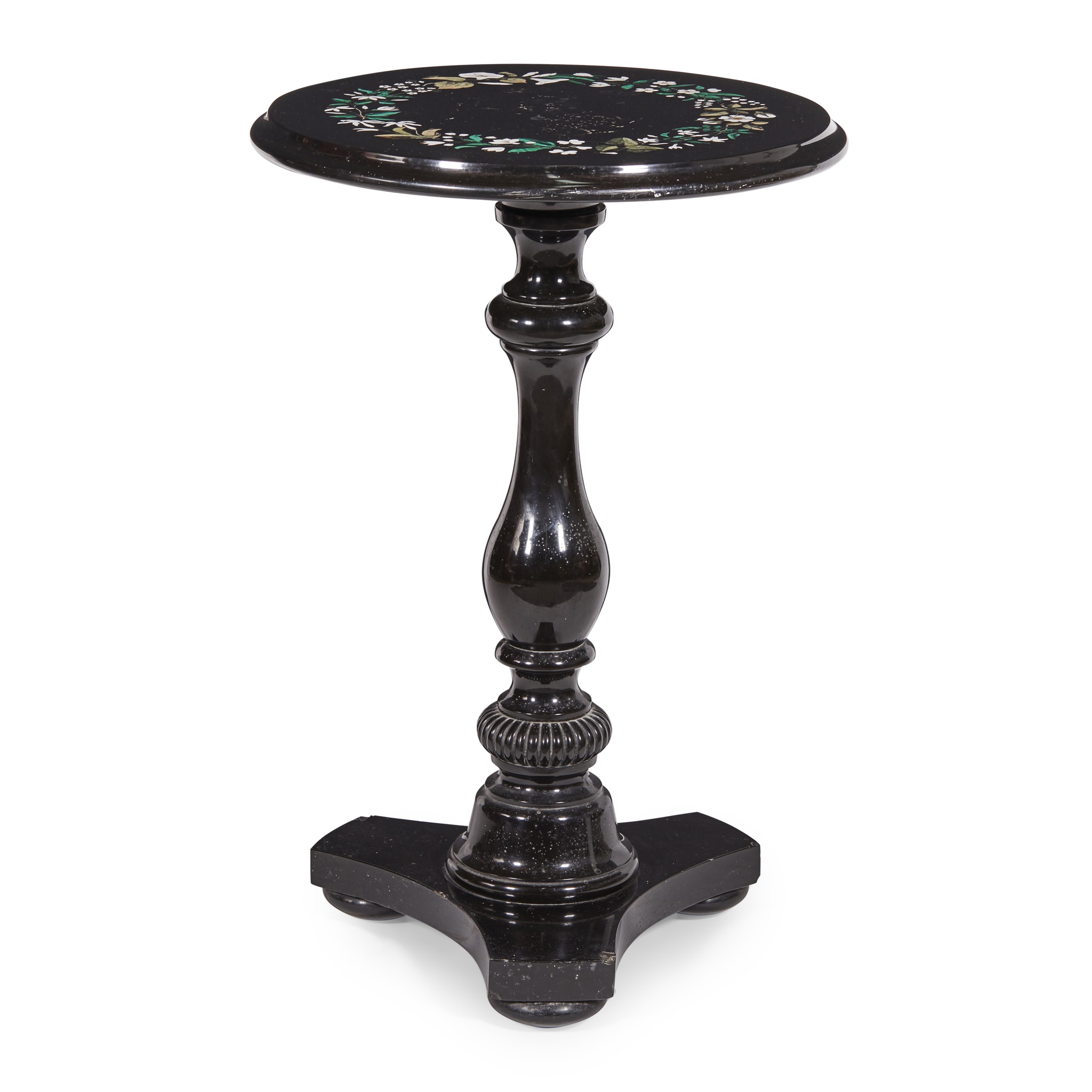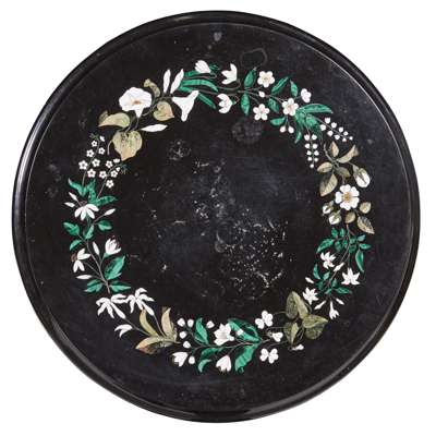 the circular top inlaid with malachite and other hardstones depicting a floral garland, on a baluster column and triform base with disc feet