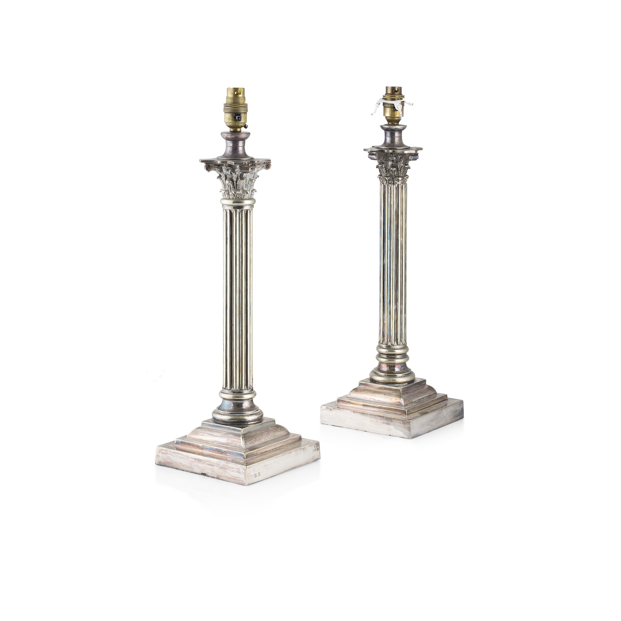 with fluted shafts on stepped bases, both stamped G.S.; fitted for electricity