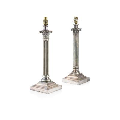 MATCHED PAIR OF VICTORIAN SILVERED BRASS CORINTHIAN COLUMN LAMPS