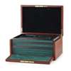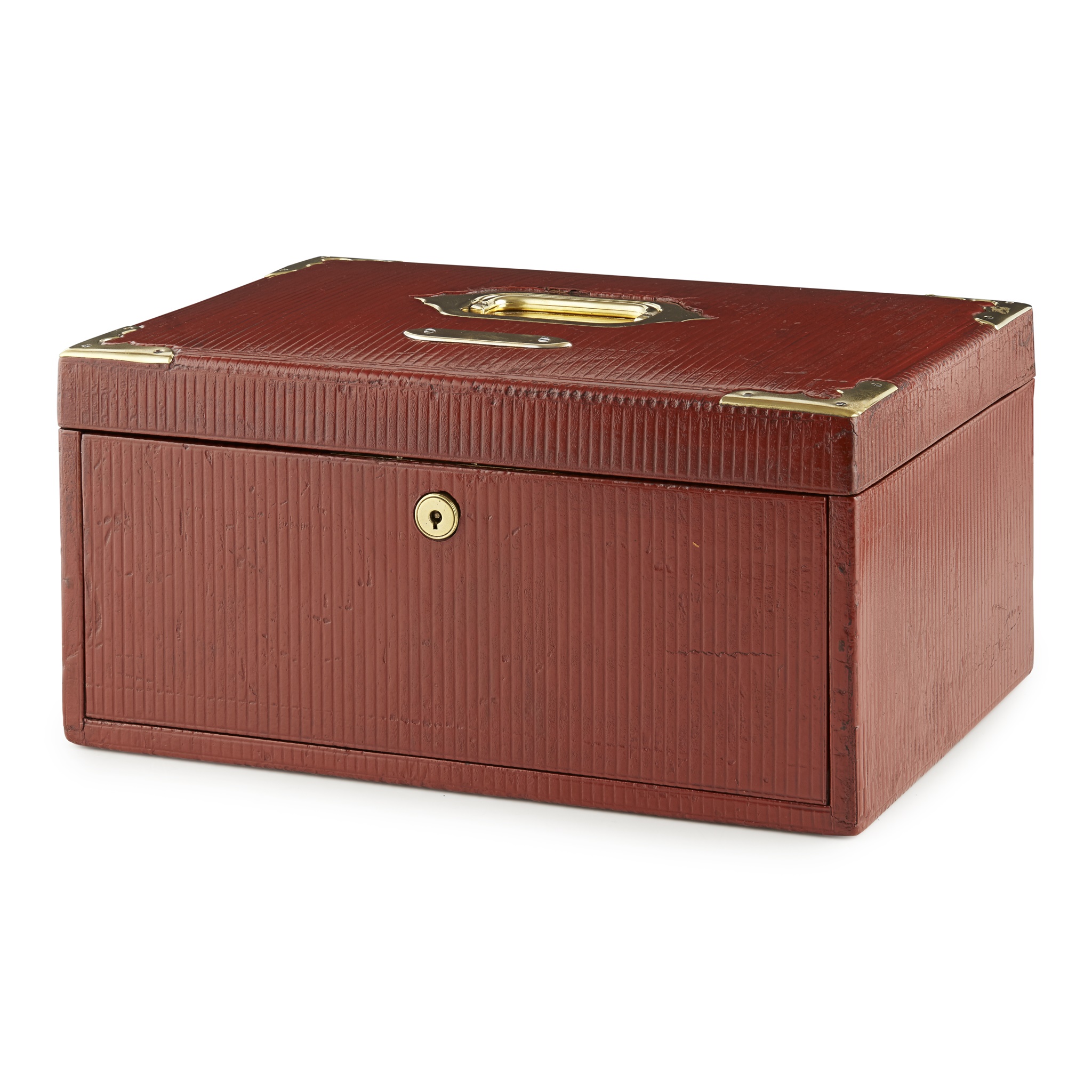 of rectangular form over-dyed in red, with brass mounts and a folding handle, opening to a velvet and silk lined interior fitted with three trays, with stamped Bramah locks