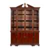 the broken pediment centred by a carved giltwood foliate cartouche, above a Vitruvian scroll carved frieze, above a pair of glazed doors opening to adjustable shelves, flanked by similar side cabinets; the base with an ogee moulded waist above plain panel doors enclosing shelves, on a plinth base with bracket feet