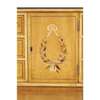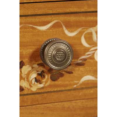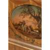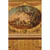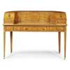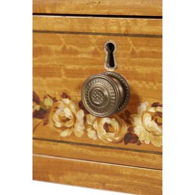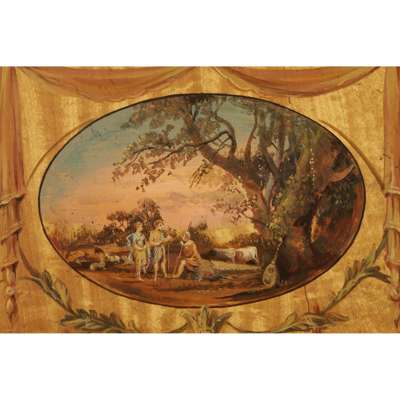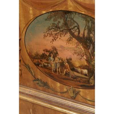 of typical form, the curved superstructure with an arrangement of drawers and cupboards, above a light brown leather insert and three frieze drawers, raised on square tapered legs ending in brass caps and castors, painted with a classical scene, foliate scrolls, husk trails, garlands, and flowering urns, with a Harrod's trade label; the armchair with a lattice splat and downscrolled arms above a caned seat, raised on faux bamboo legs