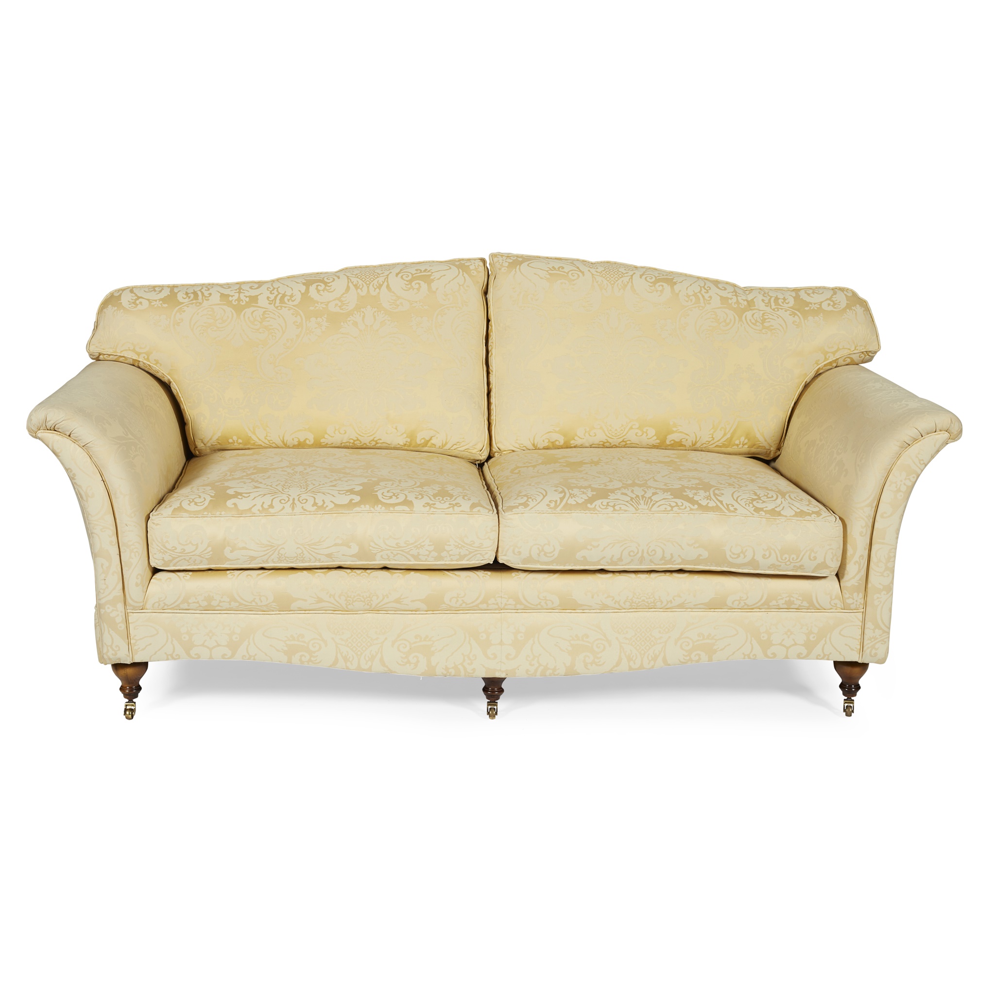 the back with two loose cushions above two cushion seats and over-padded arms, raised on turned mahogany legs with brass castors, in yellow damask upholstery