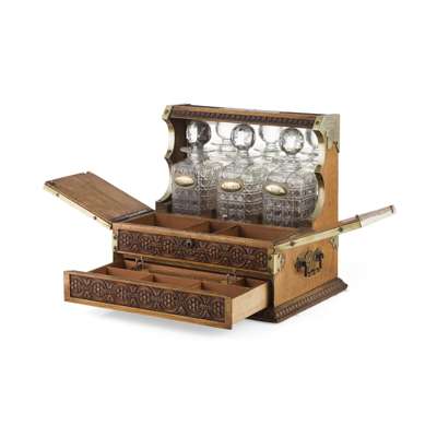 the carved case fitted with three cut-glass decanters below an engraved plaque PRESENTED TO MR EDWIN C. JOB/ BY THE COMMITTEE AND SUBSCRIBERS OF THE PITSMOOR FLORAL SOCIETY/ IN RECOGNITION OF HIS SERVICES AS PRESIDENT FOR 8 YEARS/ SEPTEMBER 17TH 1896, with a cabinet to the front with two flap top compartments above a sprung drawer