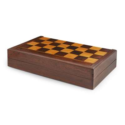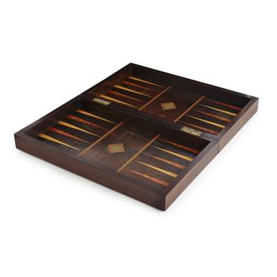 comprising thirty-two boxwood and ebonised wood chess pieces, in a box; the hinged rosewood and boxwood gameboard opening to a backgammon board inlaid with specimen woods, ivory and ebony