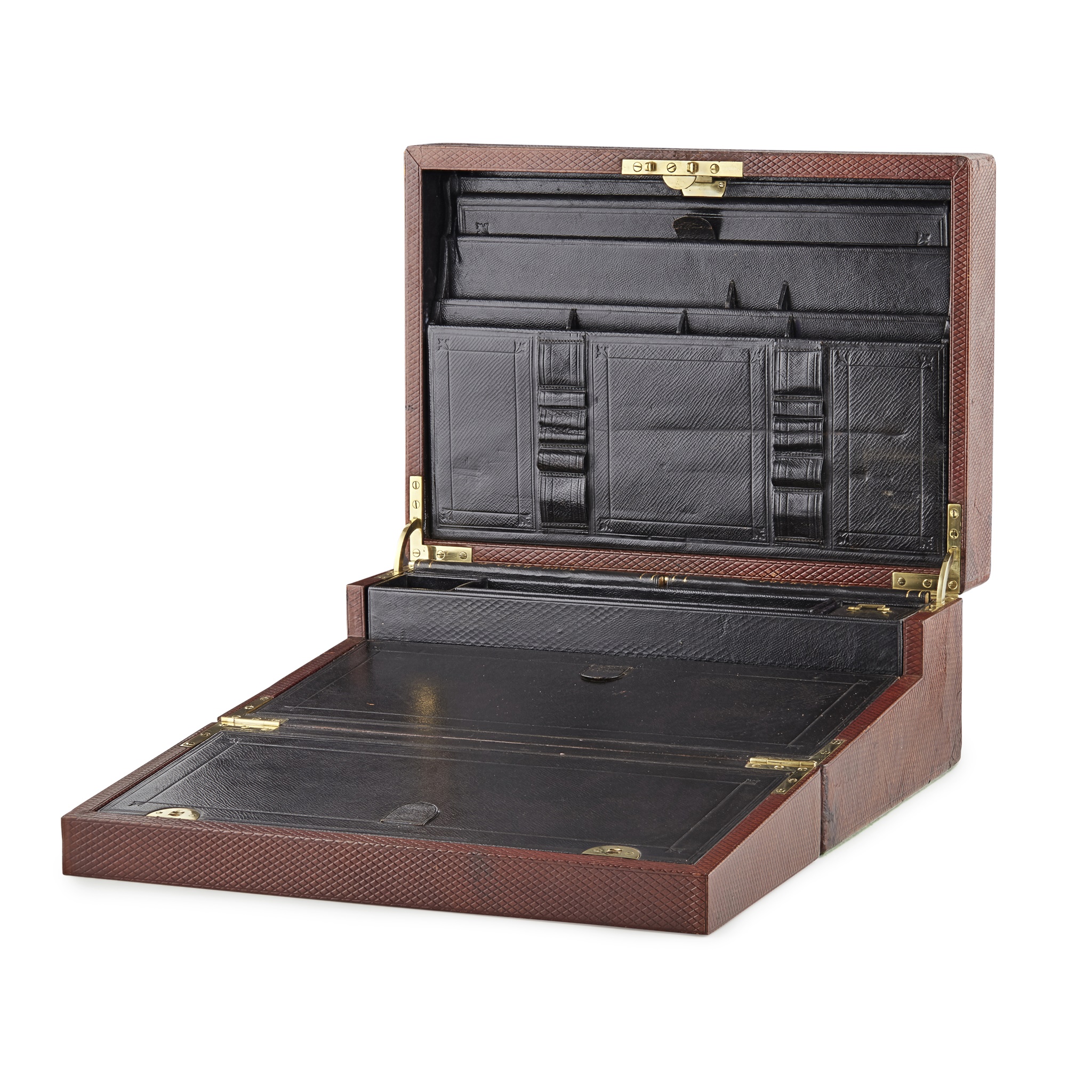 the exterior covered in embossed brown leather opening to a black leather interior fitted with a stationery rack, folio, journal, cashbook, match box and striker, pen tray and leather cased inkpot, with three ceramic memo boards, opening further to a black leather writing slope; embossed maker's mark and Bramah lock