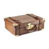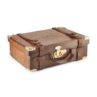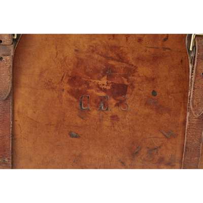 with brass corner mounts and lock, the hinged lid fitted with twin straps and embossed initials C. E. S., opening to a fitted interior with five compartments
