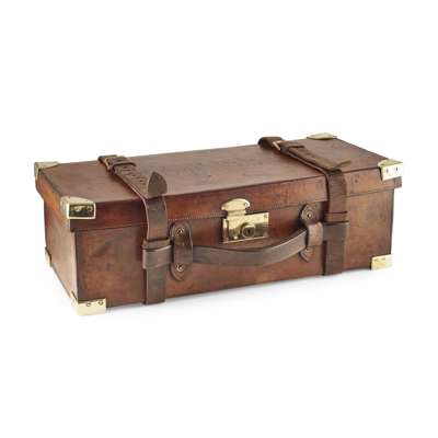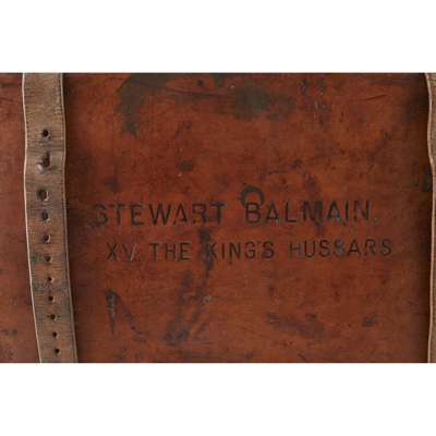 with brass corner mounts and locks, stamped with maker's marks J. HODGES, the hinged lid with twin straps and embossed STEWART BALMAIN./ XV THE KING'S HUSSARS, opening to a fitted interior with seven compartments with straps, with maker's label CHARLES LANCASTER & CO LTD.