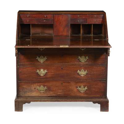 the slant front opening to an interior fitted with drawers and pigeon holes, above four long graduated drawers raised on bracket feet