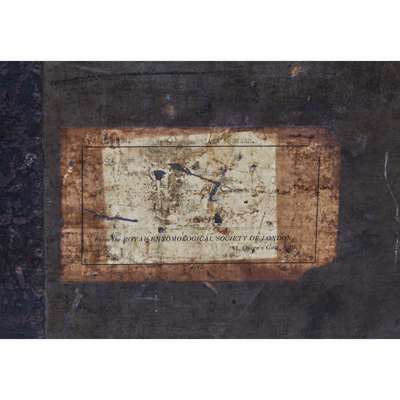 of brown canvas with metal hardware, bearing two ROYAL ENTOMOLOGICAL SOCIETY OF LONDON shipping labels, the interior with red ticking and partial maker's label