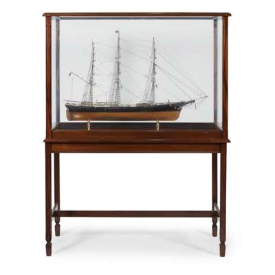 finely modelled with three masts, in a mahogany and satinwood inlaid glazed case bearing a plaque inscribed with builder, captain, etc., and a presentation plaque, and raised on a base with four moulded square legs united by an H stretcher