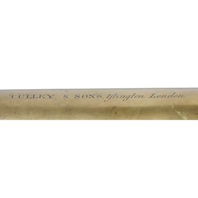 signed on the tube 'TULLEY & SONS Islington London', on a column with a tripod base with a telescope strut, on a later mahogany fluted column pedestal with a rising mechanism and brass holding brackets and three arched leg supports