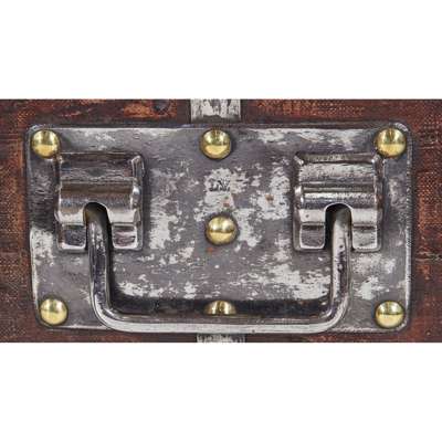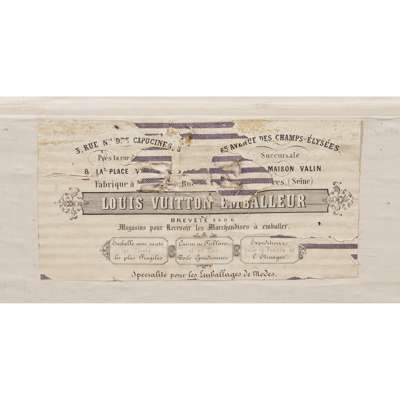 covered in dark brown canvas with wood lathes and banded with aluminium straps with brass studs and lock hardware, the handles stamped LV. opening to a void interior with ticking lining and label LOUIS VUITTON EMBALLEUR
