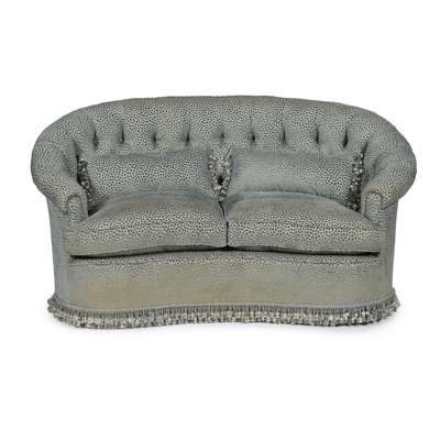 the enclosed button-upholstered back above a two cushion seat, covered in eggshell blue velvet upholstery with tassel trimming, with a Maple & Co. ivorine label