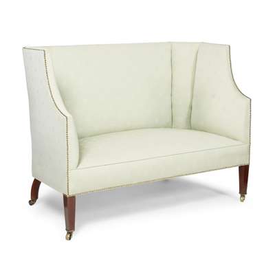 the high enclosed back and sides above a stuff-over seat raised on square tapered legs ending in brass castors, in pale green close-nailed upholstery
