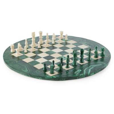 MALACHITE AND WHITE HARDSTONE CHESS SET AND BOARD