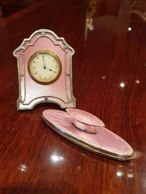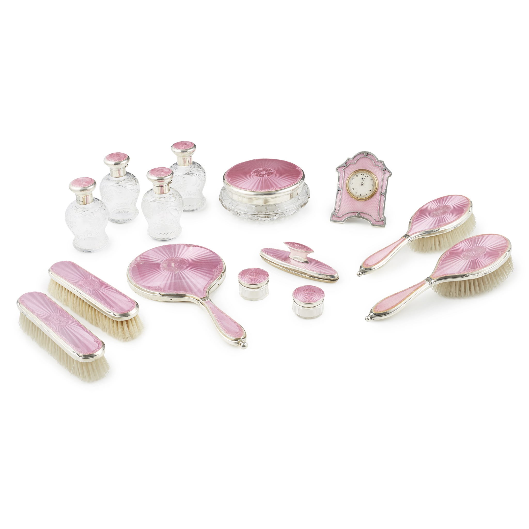 with guilloche and pink enamel backs depicting floral reserves, various maker's marks, London and Birmingham hallmarks; comprising a hand mirror; four wheel-engraved glass scent bottles, 10.5cm high; two clothes brushes, 16.5cm long; a cut-glass powder box and cover, 14cm diam.; two hairbrushes, 23.5cm long; two small covered pots, 4cm diam.; and a nail buffer, 12.5cm wide; together with a small TABLE CLOCK, of similar design and colour, London 1925, 11cm high