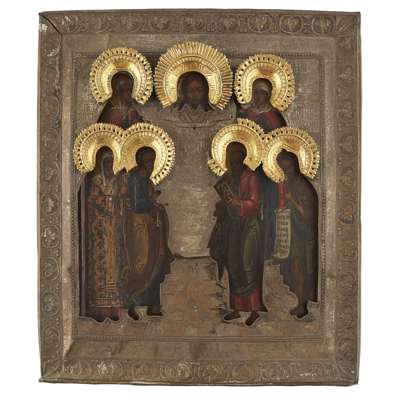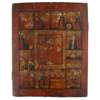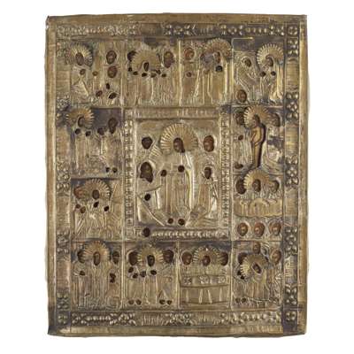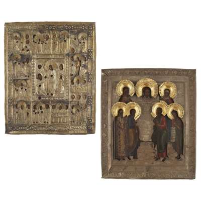 the first with a central image of Christ with saints, enclosed by twelve further scenes from his life, with a repoussé silvered metal oklad with applied halos; the second with the Mandylion with two female and four male saints, with an embossed silvered metal oklad with applied gilt halos