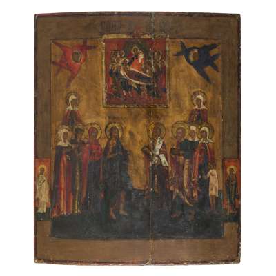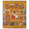 the first of Saint Nicholas the Miracle Worker enclosed with scenes from his life and flanked by standing saints on an ochre ground; the second with a square vignette of the Dormition flanked by seraphim above an array of saints, flanked by two standing saints, on an ochre ground
