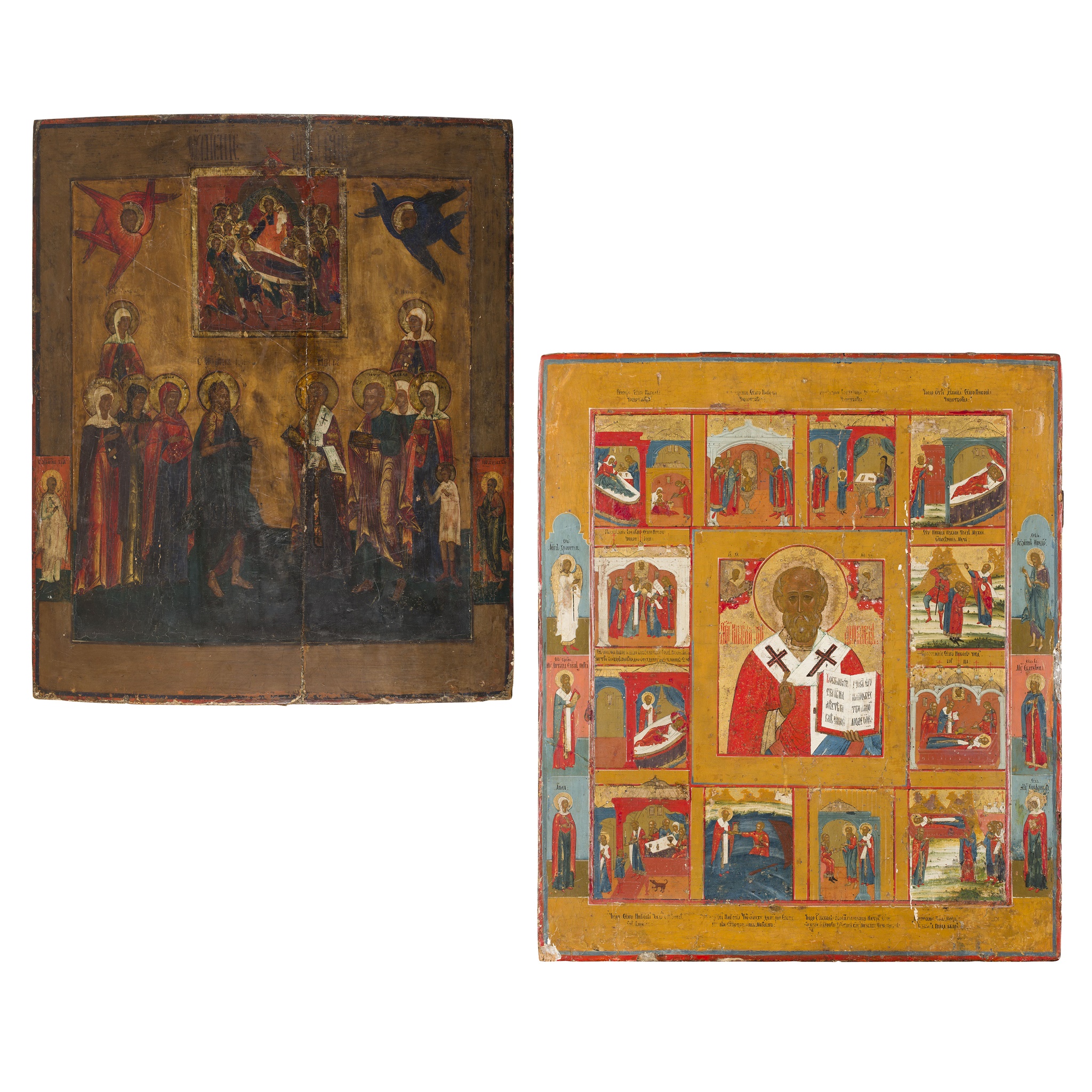 TWO LARGE RUSSIAN ICONS OF SAINT NICHOLAS AND THE DORMITION