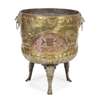 the sides embossed with gadrooning and foliate scrolls, and inset with a copper coat-of-arms, with lion mask loop handles and raised on three legs with masks and hoof feet