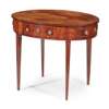 the oval top centred by oak leaf and acorn inlay, above a frieze with two real and two dummy drawers, raised on fluted square tapered legs
