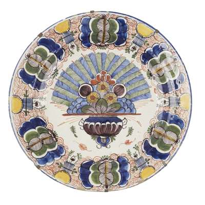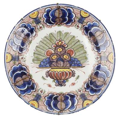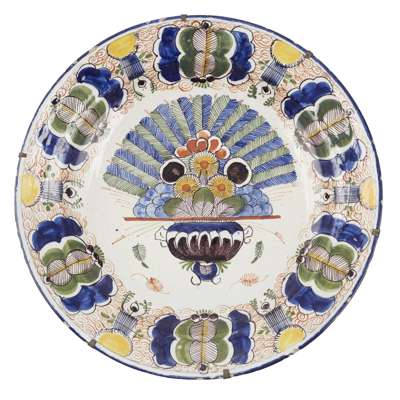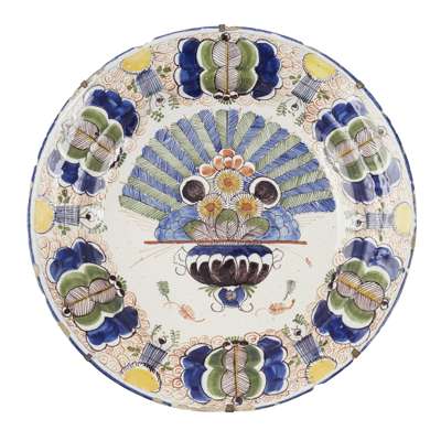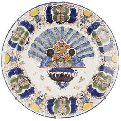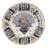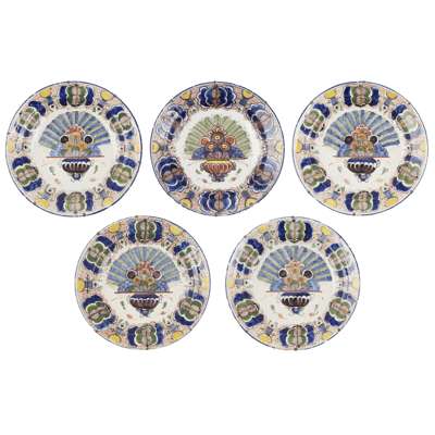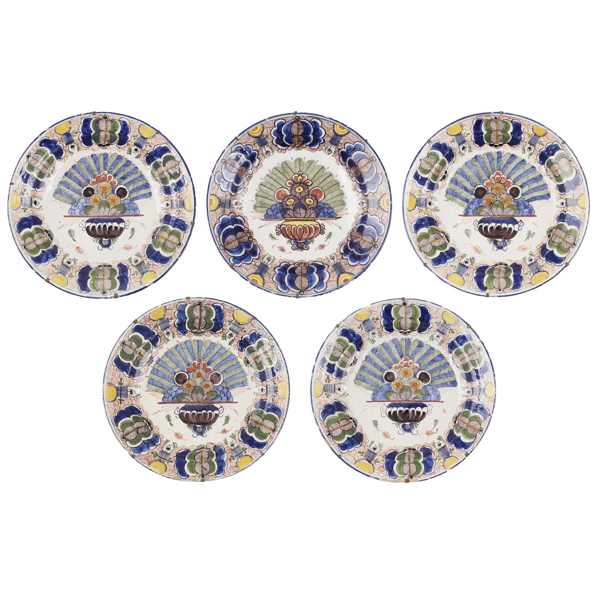 FIVE DELFT POLYCHROME 'PEACOCK' PATTERN CHARGERS, THE CLAW (DE KLAUW) FACTORY