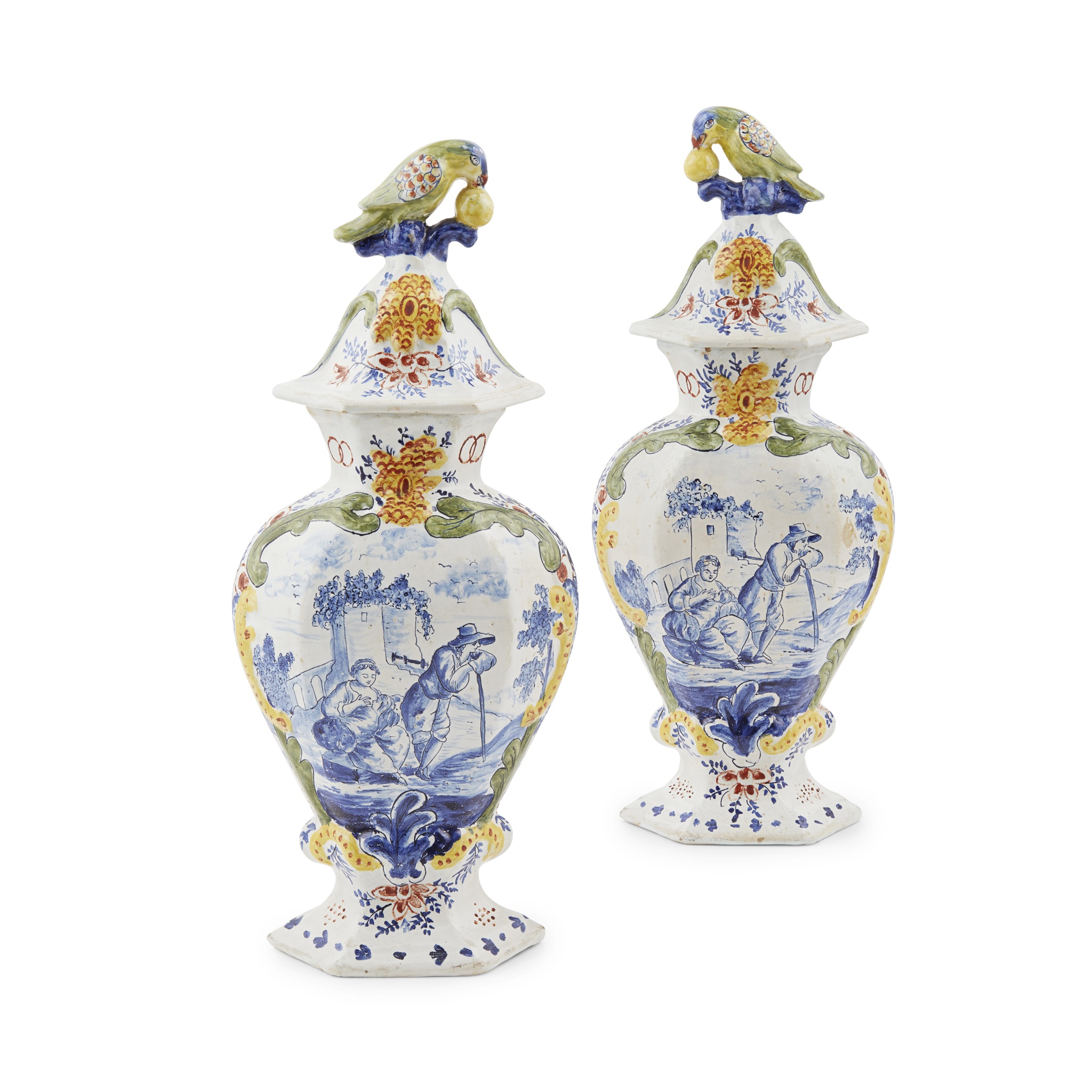 the hexagonal covers surmounted by birds, above panelled baluster bodies decorated with blue and white scenes of farming couples, within polychrome borders, with painted maker's marks