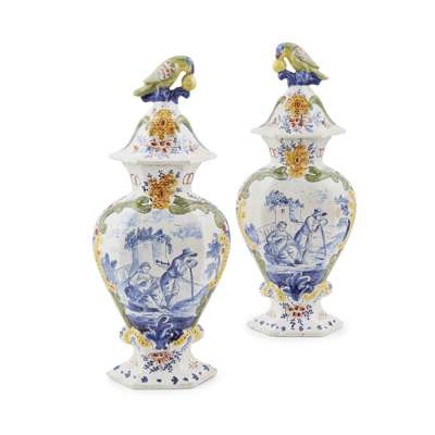 PAIR OF DUTCH DELFT POLYCHROME COVERED VASES
