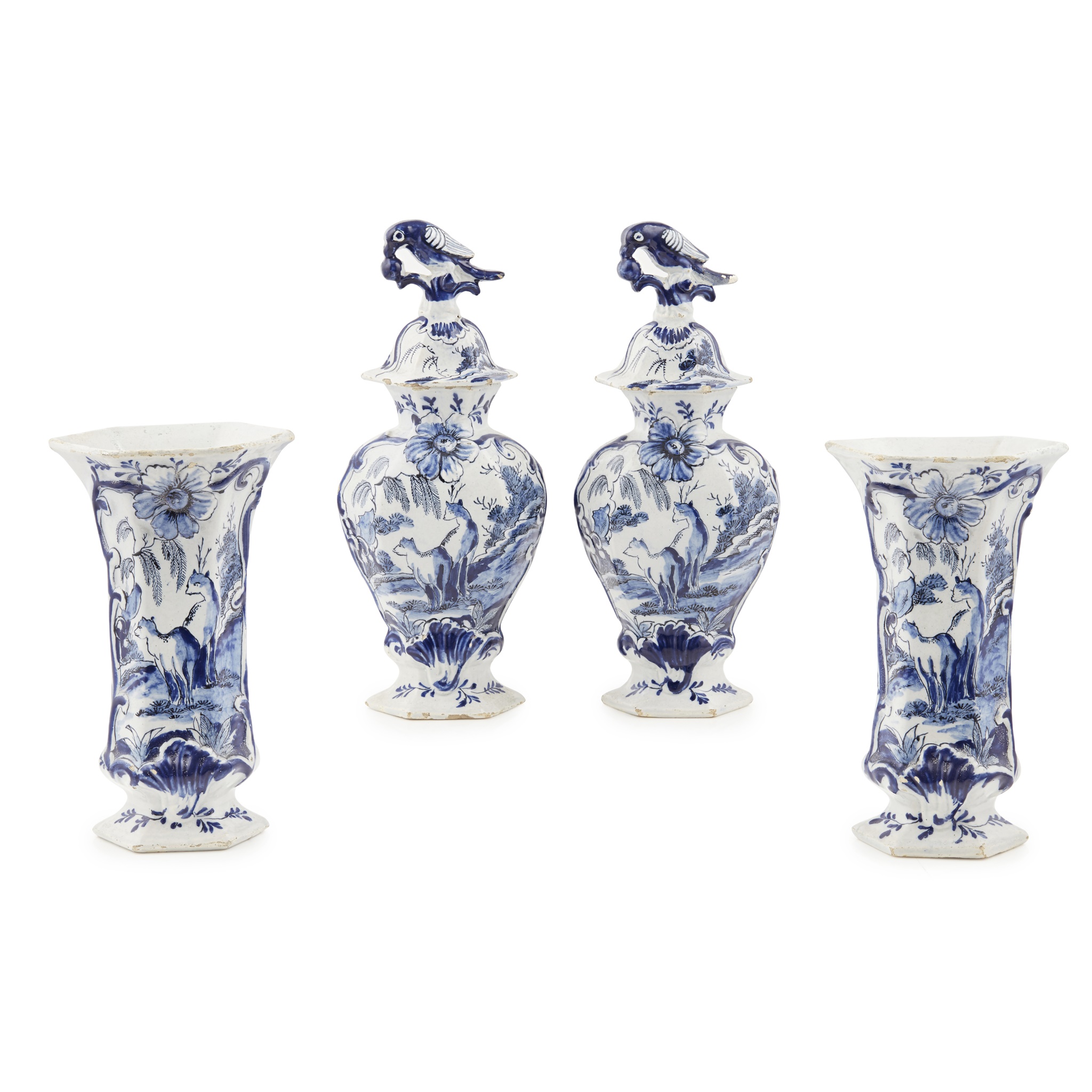 FOUR PIECE DELFT BLUE AND WHITE GARNITURE, THE CLAW (DE KLAUW) FACTORY