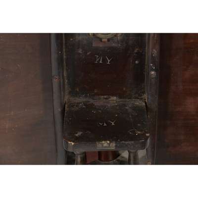 the circular tilt top on a birdcage and cannon barrel column with a tripod base and slipper feet, stamped twice 'MY'
