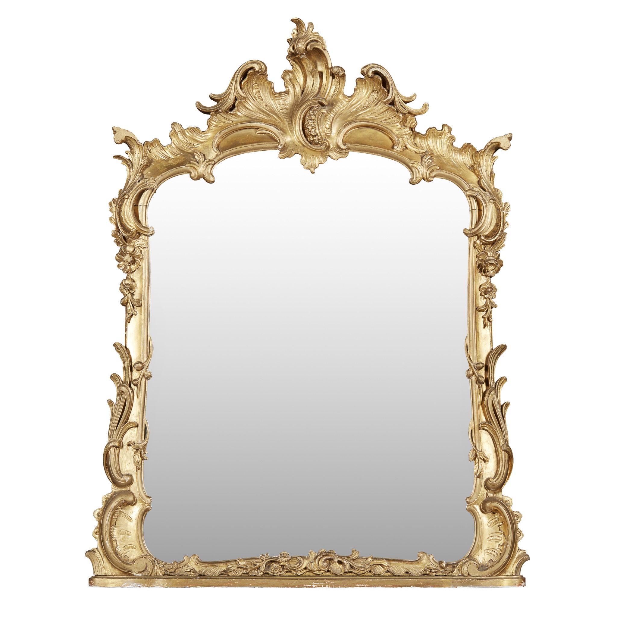 the arched mirror plate in a rococo style frame with rocaille, C and leaf scrolls