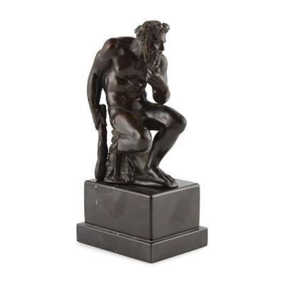 Note: Hercules is shown sitting on a rock covered by the pelt of the Nemean lion, one of his most recognisable attributes. His posture, with the fine and realistic rendering of the lean, muscled body and the powerful curve of the back is reminiscent of a long-standing sculptural tradition that leads the path from the late fourth century Greek sculptor Lysippos to Auguste Rodin’s The Thinker in the 20th century.