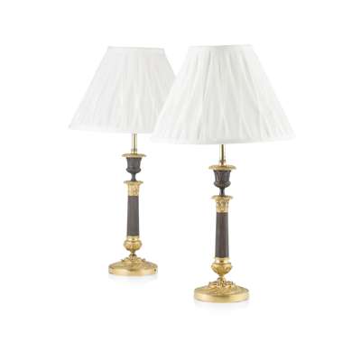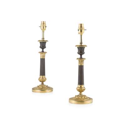 PAIR OF FRENCH RESTAURATION STYLE GILT AND PATINATED BRONZE TABLE LAMPS
