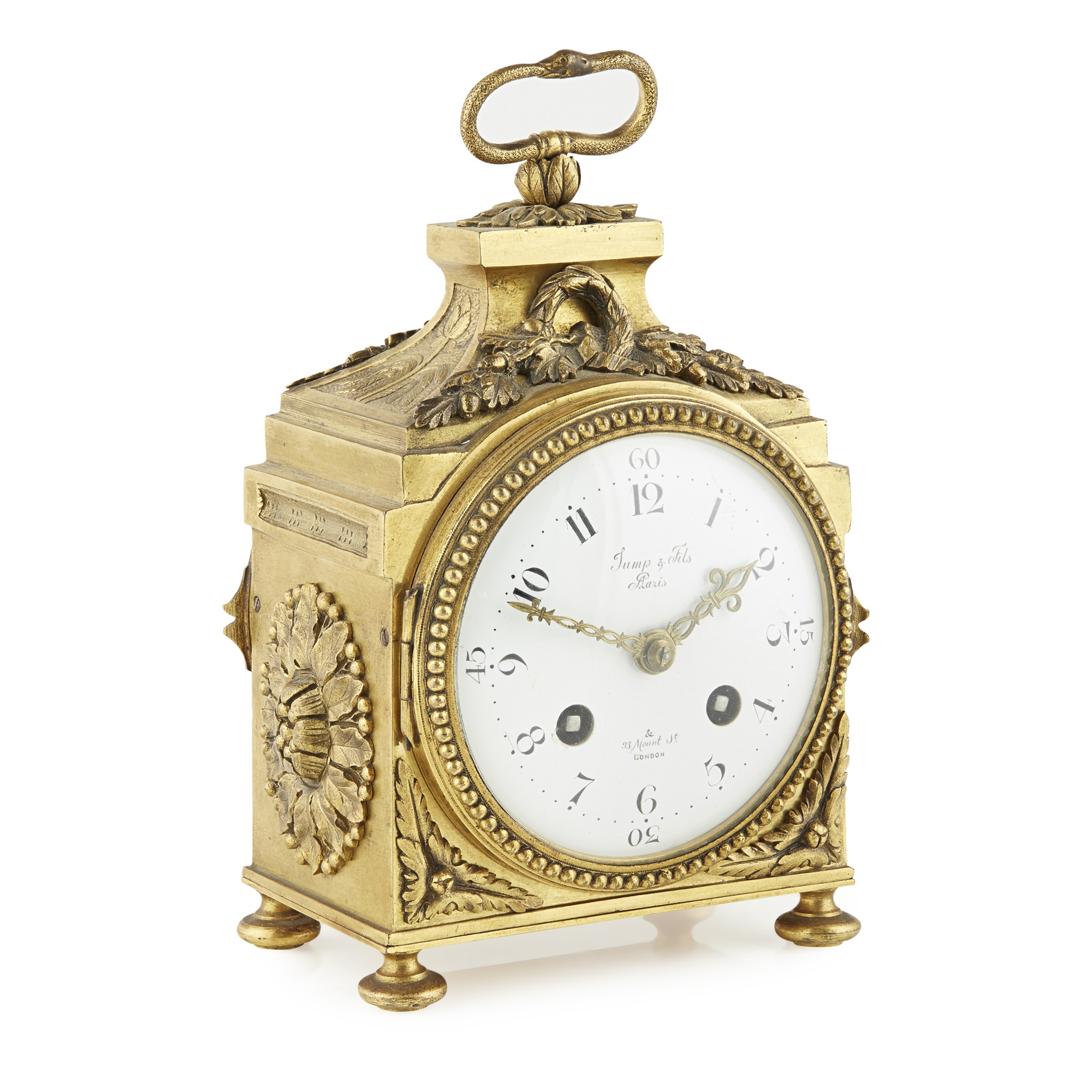 the white enamel Arabic number dial with two winding holes and signed 'Jump & Fils/ Paris' and '93 Mount St/ London', in a beaded bezel and gilt bronze case with flower heads, acorns and oak leaves, and serpent loop handle, raised on pad feet; the movement stamped S Marti et 12.5cmCie and numbered 34451, striking a bell