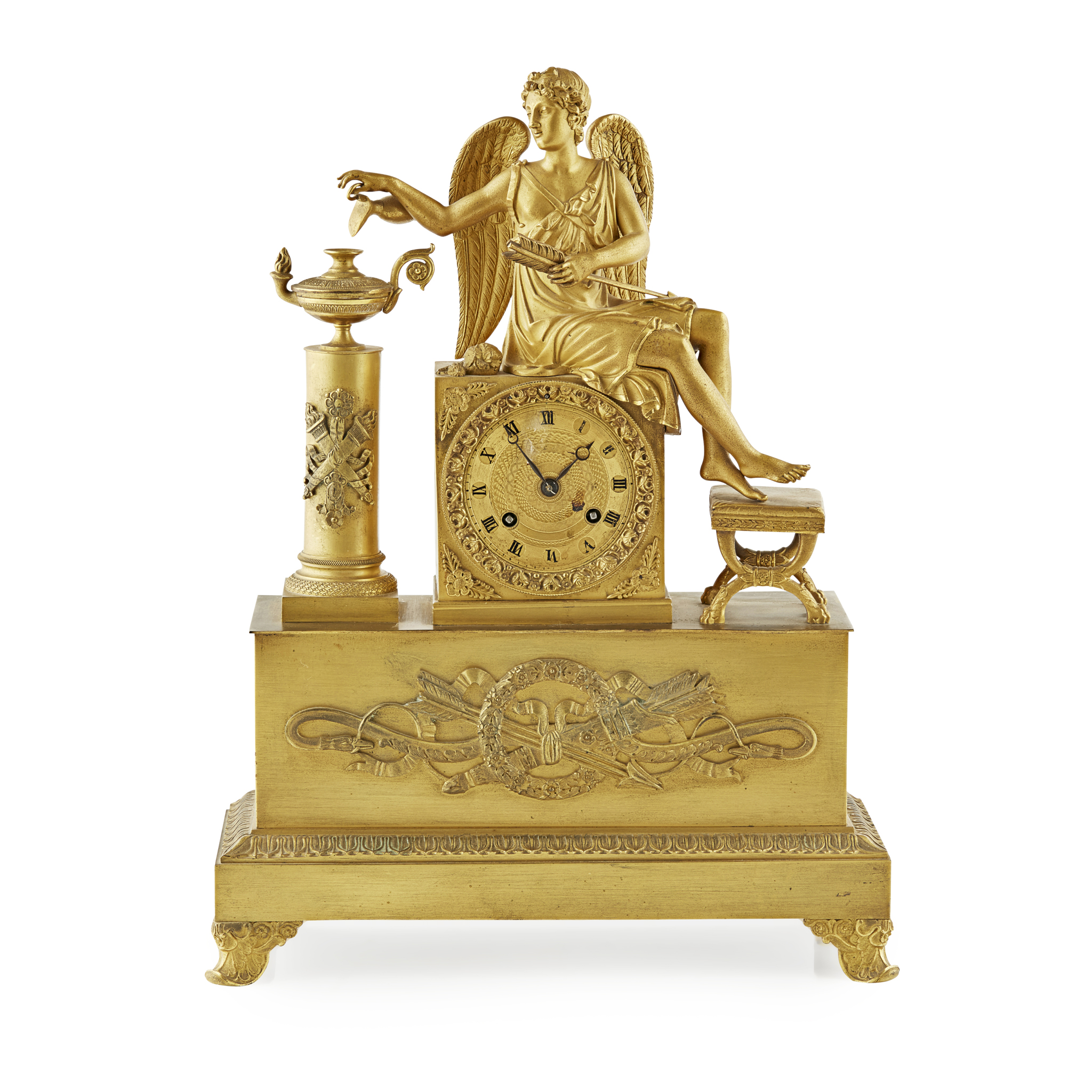 with a figure of Eros seated on a plinth holding a ewer above an oil lamp on a column, the Roman numeral dial on a rectangular base with a trophy mount, raised on scrolled feet, the eight-day movement striking a bell