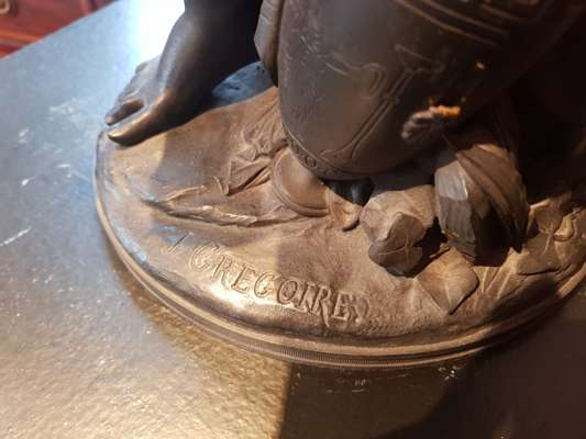 dark brown patina, the figure seated on a column base, signed GREGOIRE to the base