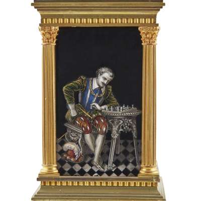 the four-glass column case enclosing a circular gilt dial with Roman numerals, and a plain gilt mask signed MACKAY & CHISHOLM/ PARIS, the sides with Limoges enamel plaques depicting a gentleman playing chess, with a platform escapement and gong strike